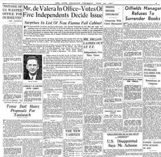 Éamon de Valera was elected Taoiseach by 74 votes to 69. The reported that "the voting came after four hours of debate made all the more exciting by reason of the fact that a number of the Independents had refused beforehand to indicate their views" and it was only during the final speeches that the five TDs declared their intention to vote for Fianna Fáil."