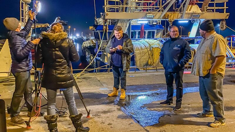 Donie O’Sullivan of CNN interviews Patrick Murphy of Irish South and West Fish Producers Organisation Patrick Murphy and fisherman Alan Carleton as Russia announces the relocation of exercises outside Ireland’s EEZ. Picture: Anne Marie Cronin