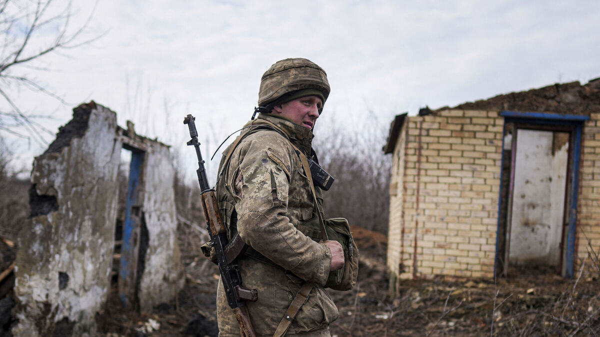 A Ukrainian serviceman stands at his position at the line of separation between Ukraine-held territory and rebel-held territory near Svitlodarsk, eastern Ukraine. Picture: Evgeniy Maloletka/AP