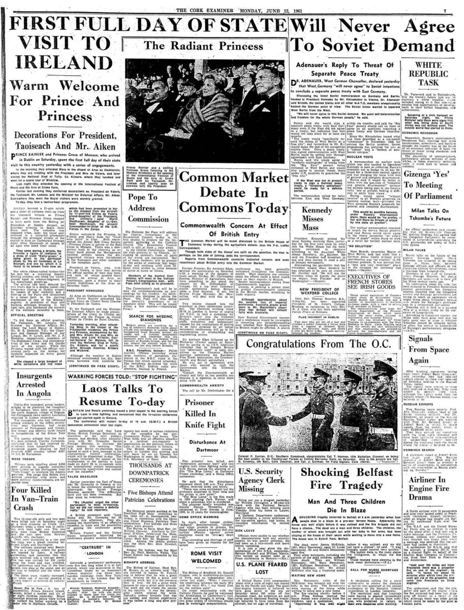 June 10: Prince Rainier and Princess Grace of Monaco arrived in Ireland. The Cork Examiner reported that “artillery boomed a 21-gun salute and a cheer of welcome went up from ten thousand throats” as they stepped out from the Boeing jet Breandain at Dublin Airport.