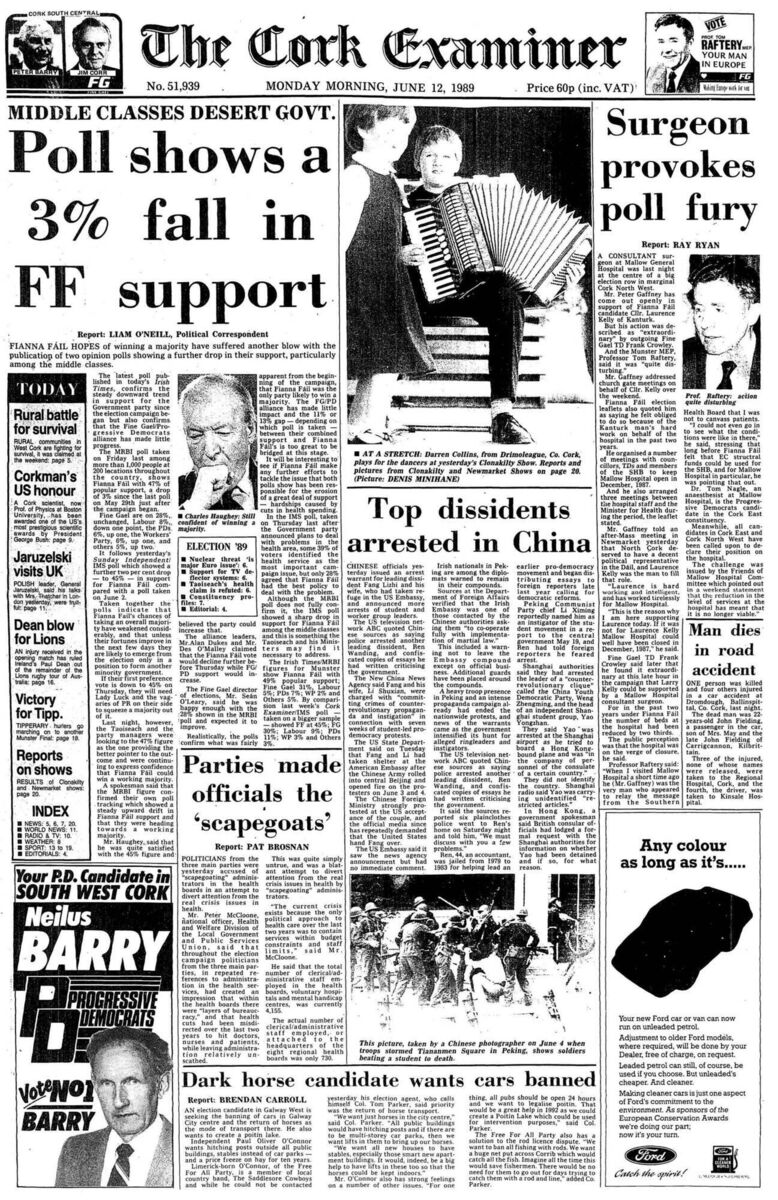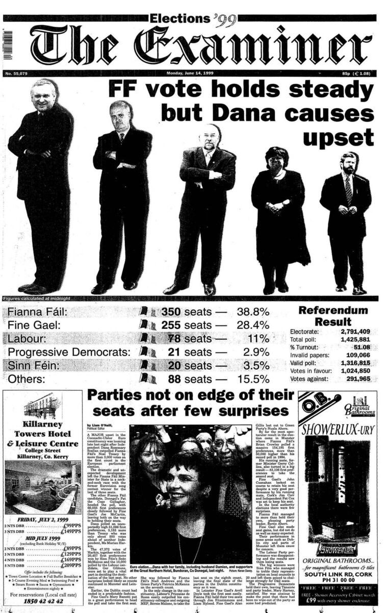 June 14: It was reported that a “major upset” in the Connacht-Ulster Euro constituency was looming after Independent Dana Rosemary Scallan outpolled Fianna Fáil’s Noel Treacy by over 3,00 votes on the first count. In the end the former Eurovision singer took one of three seats.