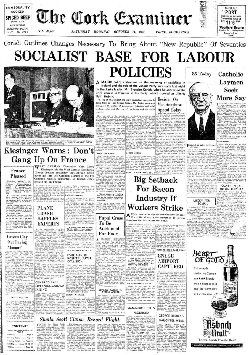 “In one of the longest and most important speeches to come from an Irish Labour leader, Mr Corish outlined changes in the system of government, industrial and social welfare policy and the role of the banks and the profit motive.”