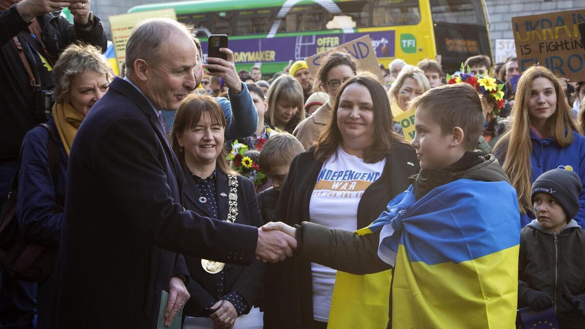 Tánaiste Micheal Martin meets a young refugee in February 2023 outside the GPO in Dublin where a rally was held to mark the first anniversary of the Russian invasion of Ukraine. File picture: Colin Keegan, Collins Dublin