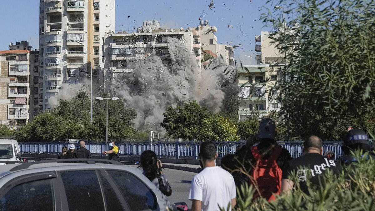 Air strikes destroyed several buildings facing the Rafik Hariri University Hospital, located on the outskirts of southern Beirut. Picture: AP Photo/Bilal Hussein