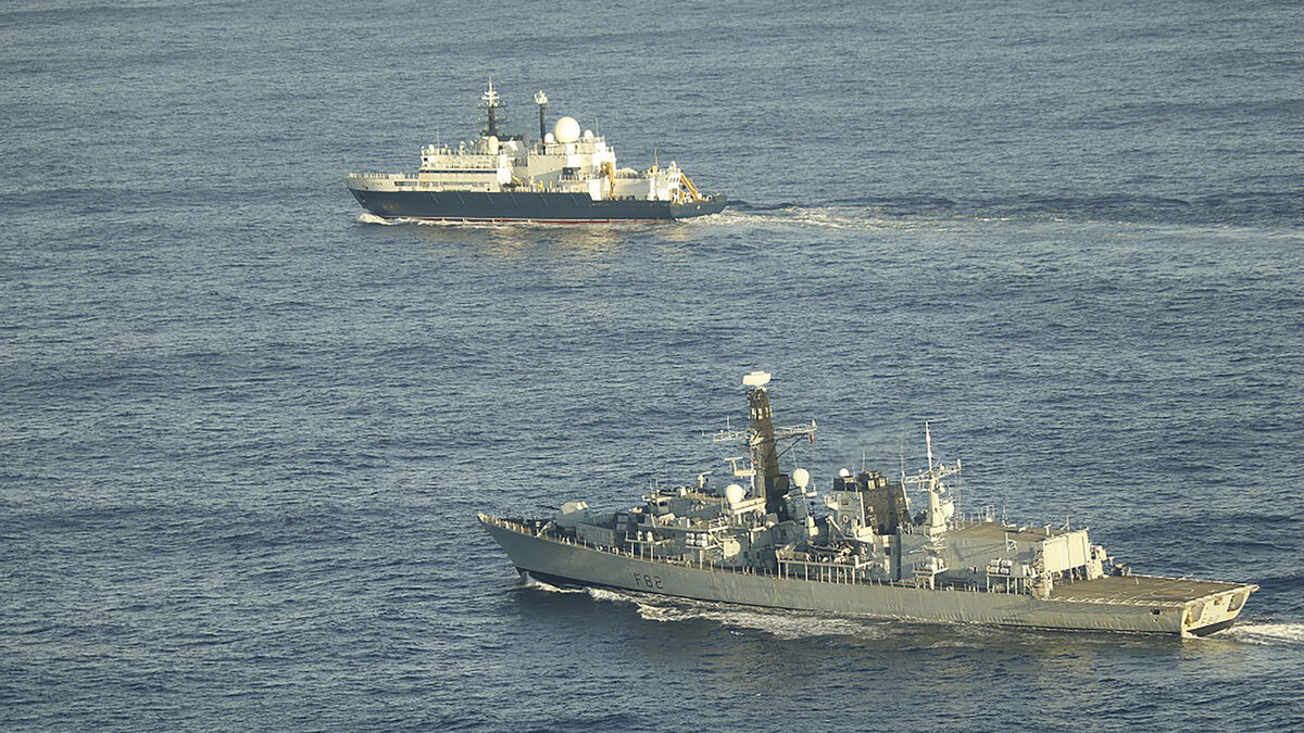 The British Royal Navy's HMS Somerset flanking Russian ship Yantar near UK waters. For Ireland, being at the far end of Europe can no longer insulate the country from Russian interference. File photo