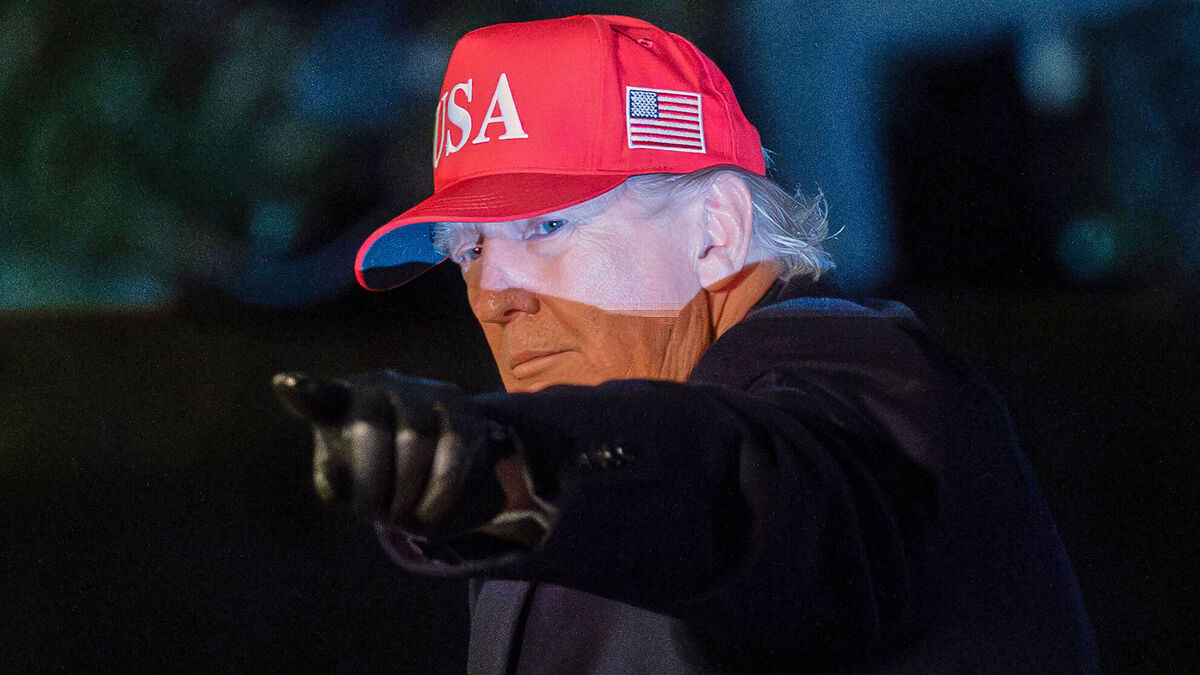 For the solemn occasion of initiating Operation Epic Fury, Commander in Chief Donald Trump donned a baseball cap and several layers of pancake make-up. Picture: AP/Jose Luis Magana