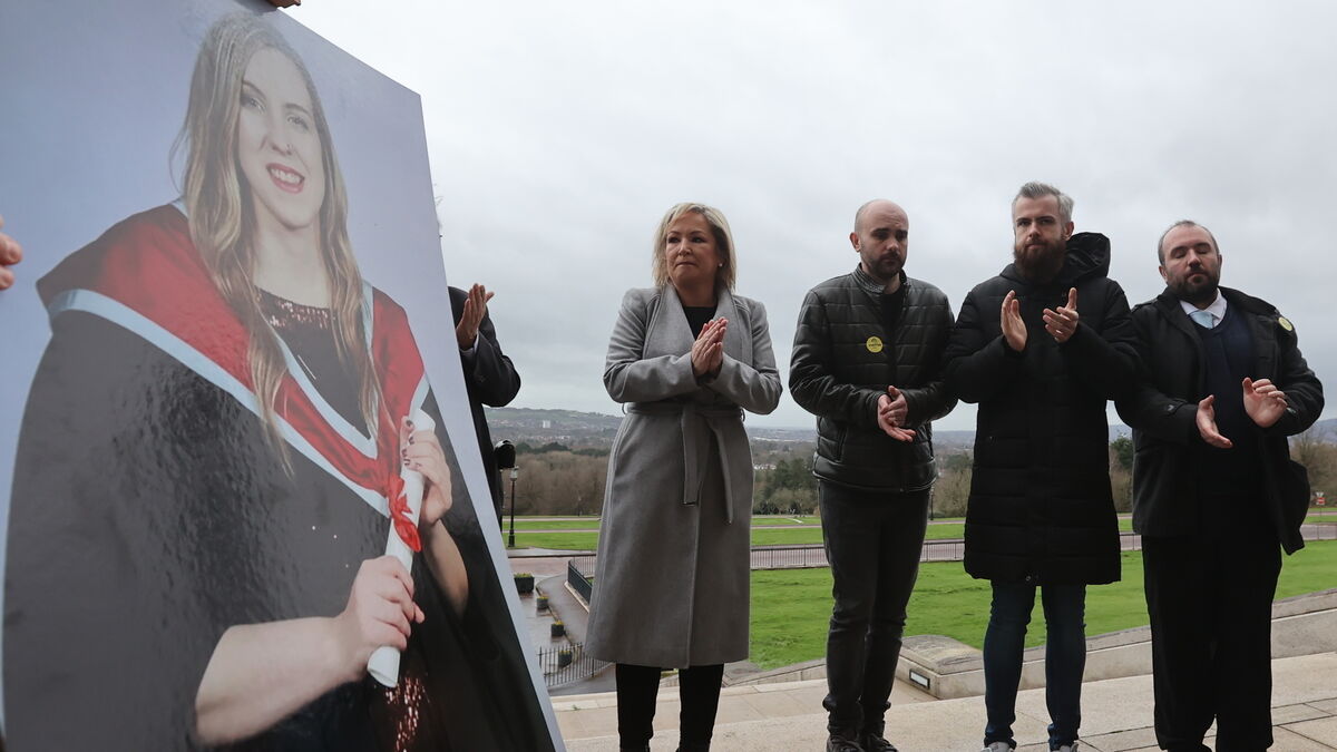 Sinn Féin vice president Michelle O'Neill outside Belfast's Parliament Buildings in January 2023 with Natalie McNally's brothers (left to right) Declan, Niall and Brendan during a vigil for women who have died in violent circumstances. File picture