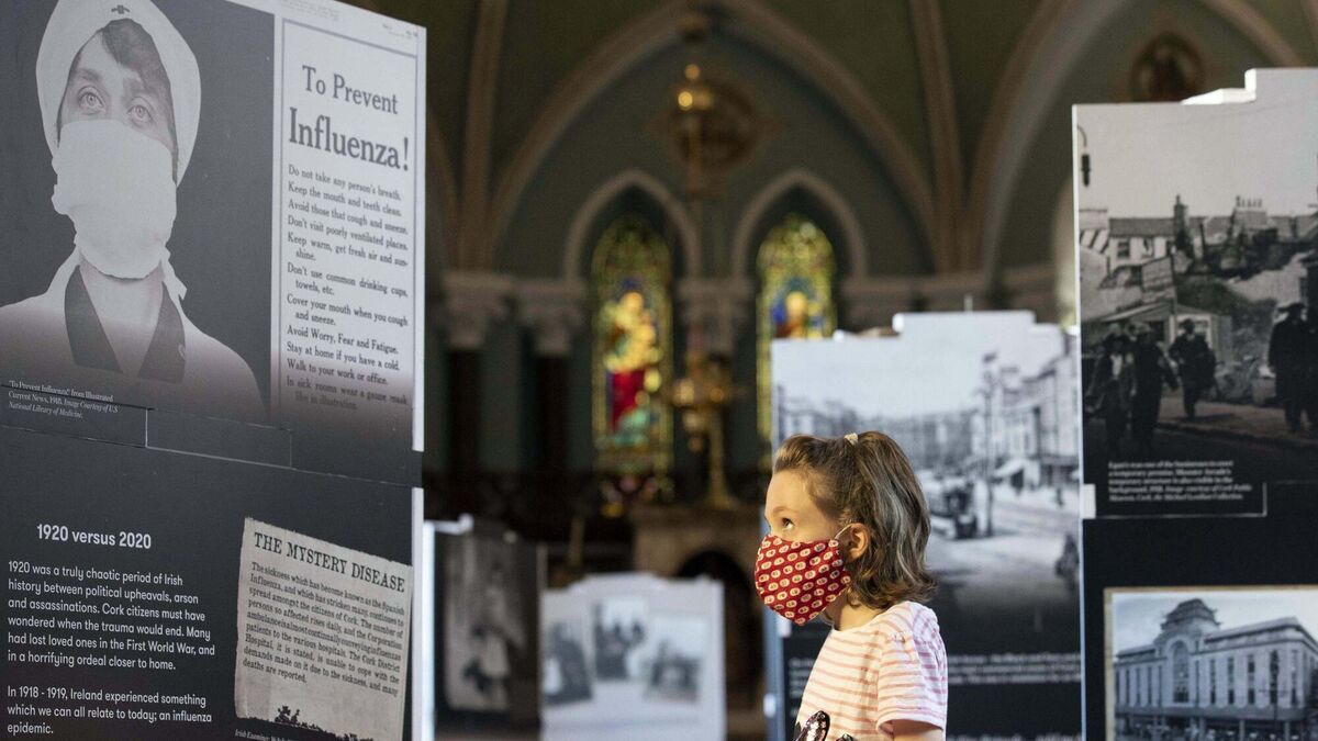 Rosie O'Toole discovering how sometimes history repeats itself at the Small Lives exhibition, including this panel about the 1918 flu pandemic, at Cork's Nano Nagle Centre in September 2020. Picture: Clare Keogh