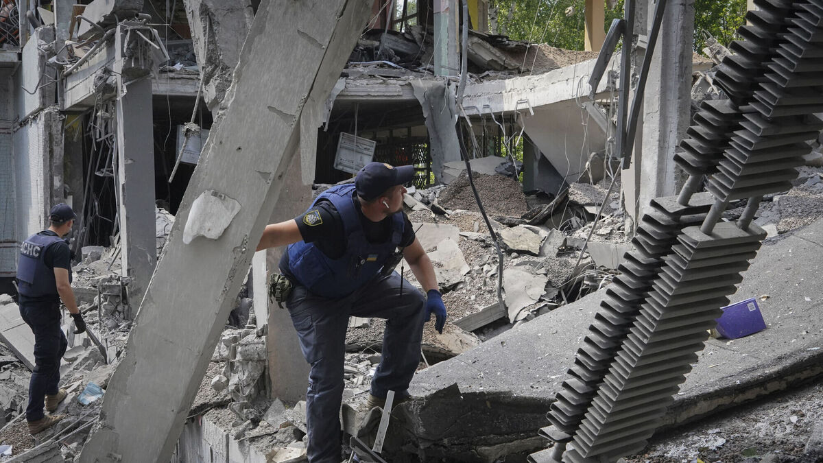 Ukrainian Emergency Situations Ministry employees search the site of a bombing in the school where a graduation ceremony, called the Last School Bell, was supposed to take place in Kharkiv, Ukraine, on Thursday. Picture: AP Photo/Andrii Marienko