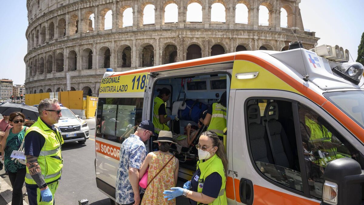 Paramedics help people coping with high temperatures at the Colosseum in Rome last week. Storms and wildfires brought on by heatwaves killed seven people in Italy on Tuesday. Picture: Antonio Masiello/Getty
