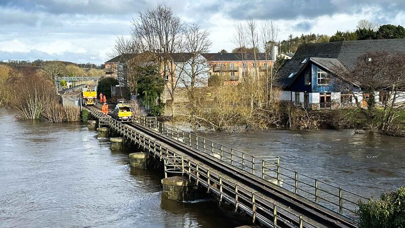 Repairs underway at the Dublin to Rosslare train bridge across the Slaney at Enniscorthy, Co Wexford, after the river burst its banks. Picure: Eamonn Farrell/RollingNews.ie