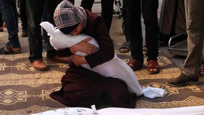 Samia al-Atrash holding the remains of one of her sister's children from the Khoder family, killed in an Israeli bombardment in Rafah in Gaza on October 21, 2023. Picture: Said Khatib/AFP/GettyÂ