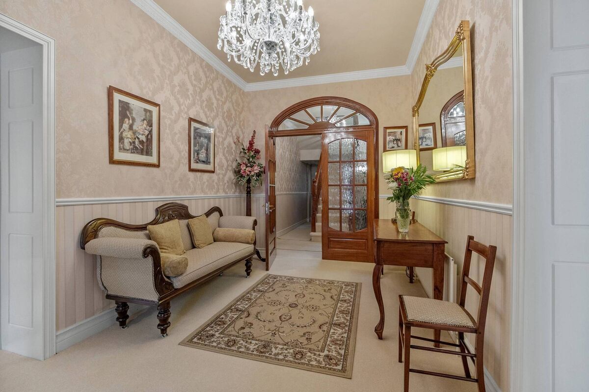 The main, five-bay house and lofted buildings, sort of set diagonally across the 26.7-acre land block from the lodge, could fool some into thinking it’s a new/modern build, given its crisp external render with contrasting corner quoins, pvc ‘Georgian-style’ double glazing throughout, plus similar glazing carried over into the slate-roofed front porch and side sun room, and there’s oil central heating and pretty assured creature comfort given it scores a B3 BER.