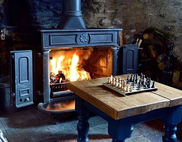 Now, the accommodating home has a kitchen with sturdy pitch-pine units, Belfast sink and Sorn oil-fired range cooker, there are four bedrooms with master en suite, dining room, high-ceilinged living room with old stone chimney hearth and heat-pumping wood-burning stove, backing up the house’s ground level underfloor heating, beneath slate floors.