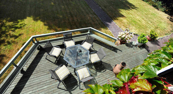 A specially made fireplace in pewter and Carrara marble holds the sacred place and furniture is soft and inviting around a massive marble coffee table. This double room is ideal for entertainng and overlooks the deck outside, which is ingeniouse is the way it’s built in seating also creates a safe boundary for children — and perhaps adults at a certain time of the evening.