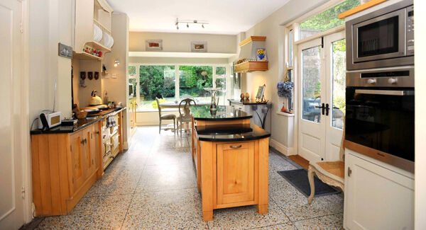 So, there’s an extension to the kitchen, but it’s a big bay window onto the garden where the informal dining table sits and the terrazzo was extended outwards from the kitchen.
