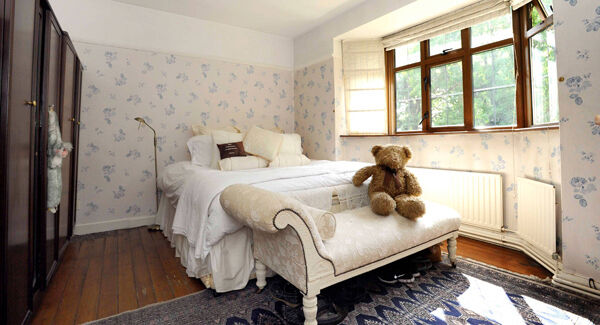 The upper floor has four bedrooms, all ranged southwards around a long landing and the family bathroom, (a symphony in French grey and dark grey and silvered wallpaper) bookends the run to the west, with the smallerst room, now a study/dressing room, to the east.