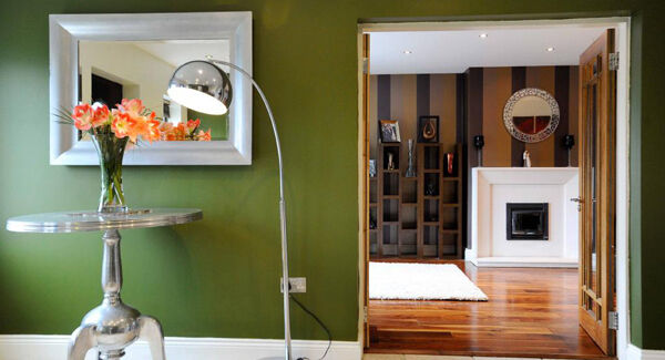 The interior is bright and modern, with walnut doors, marble tiling and timber flooring and the owners have carried the same colour theme throughout the house ā using a warm shade of olive green on some of the walls in the hall, dining room and landing.