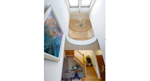Local craftsmen were used to create two staircases — an oak staircase with cream spindles at the front and a gold coloured spiral wrought-iron staircase with oak treads at the rear.