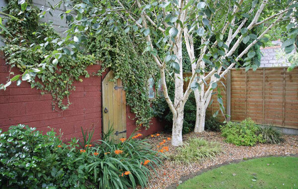 The walled boundaries are greened-in in front, maturing all the time, while there’s also an old wooden door set in a back wall as a sort of trompe l’oeuil.