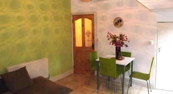 The kitchen walls are turquoise while the adjoining dining room has been painted lime green and is illuminated by shimmering reflections from a circular pink pendant light. The décor is modern and funky and includes a large bathroom with a contemporary look and a stylish Jacuzzi bath.