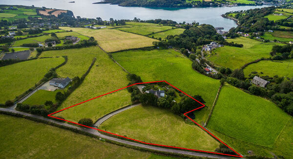Glandore exerts its own “golden aura” on property sales, getting some of the highest prices in all of West Cork and, whilethis offer doesn’t have water frontage, or even shoreline proximity, as it’s set above the scenic seaside village and sailing centre, it does have views, aspect, and privacy, set back as it is from the road by two paddocks and a long drive between them.
