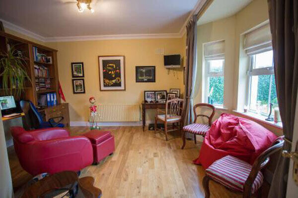 There’s also a formal sitting room, with white marble fireplace, and second reception with bay window, currently in use as a study.