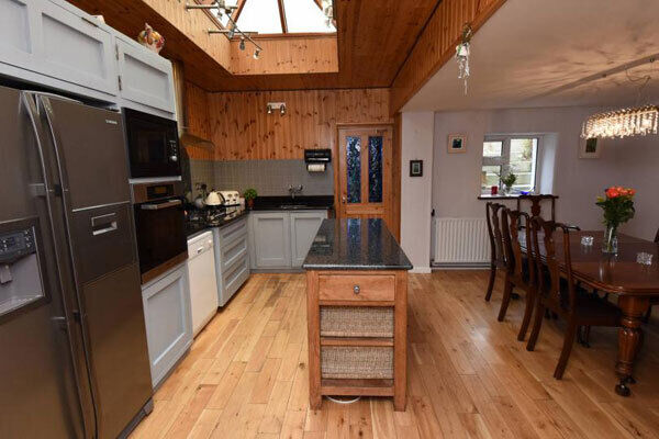 To the back of No 1, reached from double doors in the rear reception, is a decent-sized kitchen/dining room added on in 2008, which is north-facing and its sloping, membrane-sheathed roof has a glass lantern or pitched window section put in to get in as much light as possible.