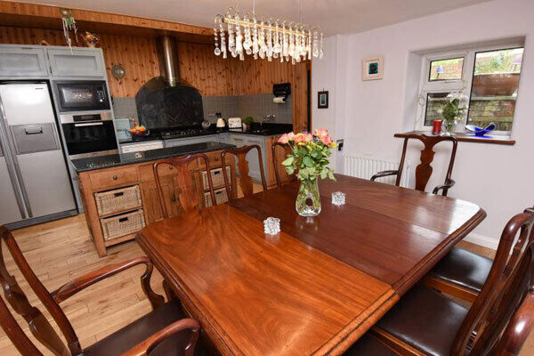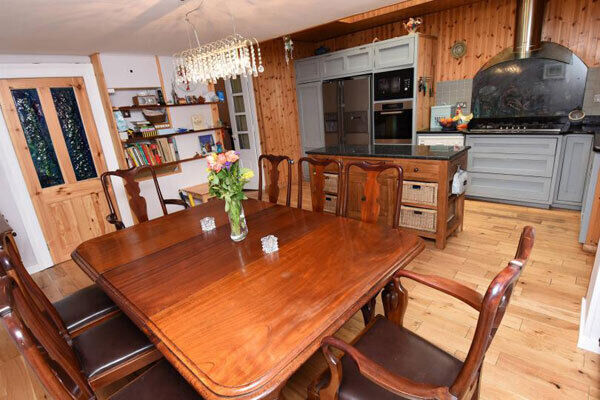 Walls in this homely place are extensively clad in pine boards, units are topped in black granite and the gas hob has a curved, Miele extract, and a quirky one-off painted splashback depicting a lobster, behind a glass screen.