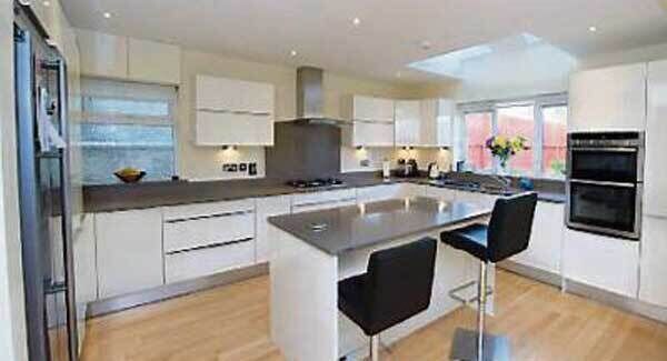 The kitchen’s quite slick looking with gloss units and island, topped with beige Silestone, and the back wall by the dining table effectively is all glass, with over-sized glass sliding door.