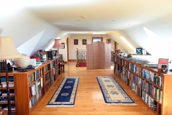 Directly overhead is a galleried landing and library, a quiet music and reading space with many hundreds of reference books, illustrated books, history books and coffee table titles in neat banks of low-lying shelves.