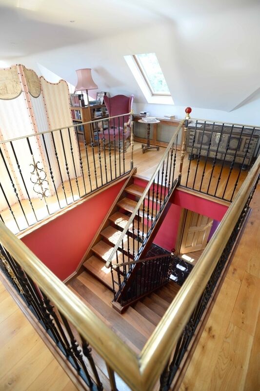 To the east at both ground and first floors is the bedroom wing, two per floor, both en suite downstairs (including the master bedroom) and there’s a further bathroom for the top floor’s two bedrooms, gallery and enormous lounge-office/playroom at the far end of the house.