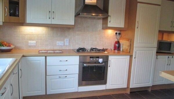 It has front and back reception rooms, each with black cast iron fireplaces (the front one’s gas-fired), there’s gas central heating, double glazing, external walls have been insulated, bedrooms have built-ins, the house has been rewired, the replacement kitchen’s simple, with a white ceramic sink and drainer, and there’s now a ground floor guest WC too.