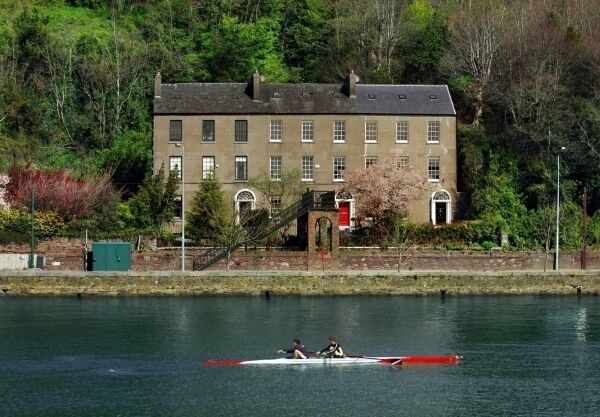Built of old sandstone and backing into a quarried-out red sandstone cliff facing south over Cork’s River Lee and the Marina at Tivoli just east of the city centre, this quality conversion in a hideaway, glen-like setting is said to predate the three quite grand 1840s-built terrace properties at Bellevue Villas (pictured, centre).