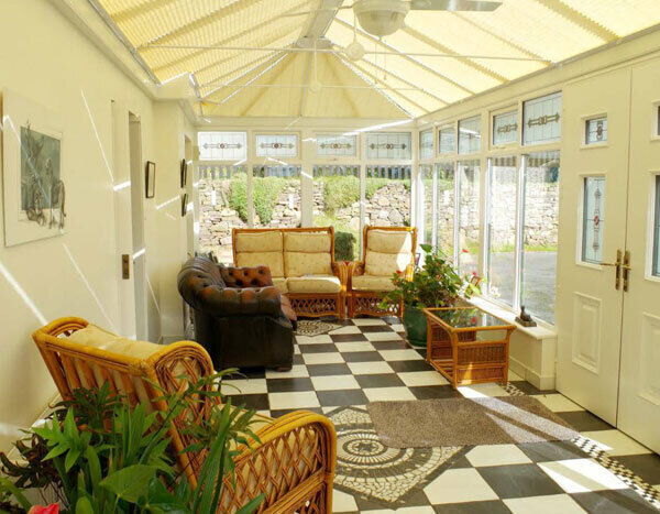 At the front of the old farmhouse is a long, tiled conservatory which provides space on one side for a dining room and a sitting area at the other. Its windows overlook a large expanse of green lawn, some rose bushes, the restored stone out houses and a stone pillared entrance.