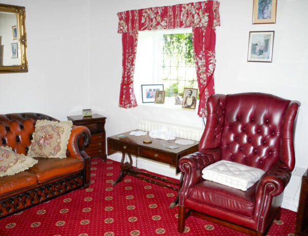 Beyond this are two more sitting rooms which have also kept their original exposed rafters. One is a ‘red’ room which has red carpets, curtains and leather furniture as well as a huge old stone fireplace with a stove in the centre.