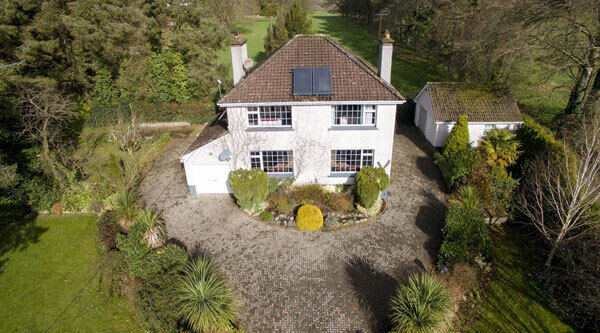 Glimpsed over the rear stone wall and ditches is grazing land associated with Richard Woods’ extensive farm property at Carrigrohane — in fact this detached family home is set quite close to the land, positioned towards the back of its circa half-acre of mature, well-planted, screened grounds.