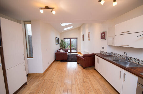 Internal flooring is solid maple and worktops are solid hardwood, with mosaic tiled splashback, and also at ground is a utility with gas boiler and guest WC.