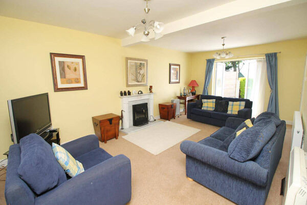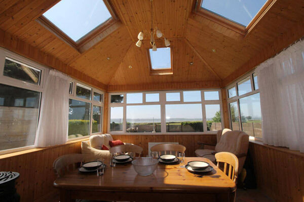 Accommodation includes a carpeted sitting room with a fireplace, a tiled kitchen with fitted units and a sunroom at the rear with timber cladding and views of the garden and the beach.