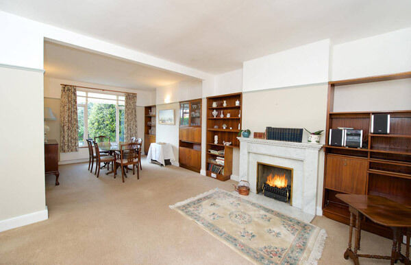 Dating to the 1950s, this inviting home on neat gardens with extra space to the side giving it additional floor area, has a lovely, old-fashioned feel to its interconnecting original reception rooms, which run front to back, with extra-high ceilings, picture rails, marble fireplace (gas insert) and carpeting.