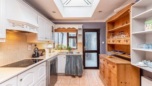 This kitchen is pleasantly bright, thanks to an overhead pitched roof light or window, and the room’s far end overlooks the small yard, with plumbed utility behind.