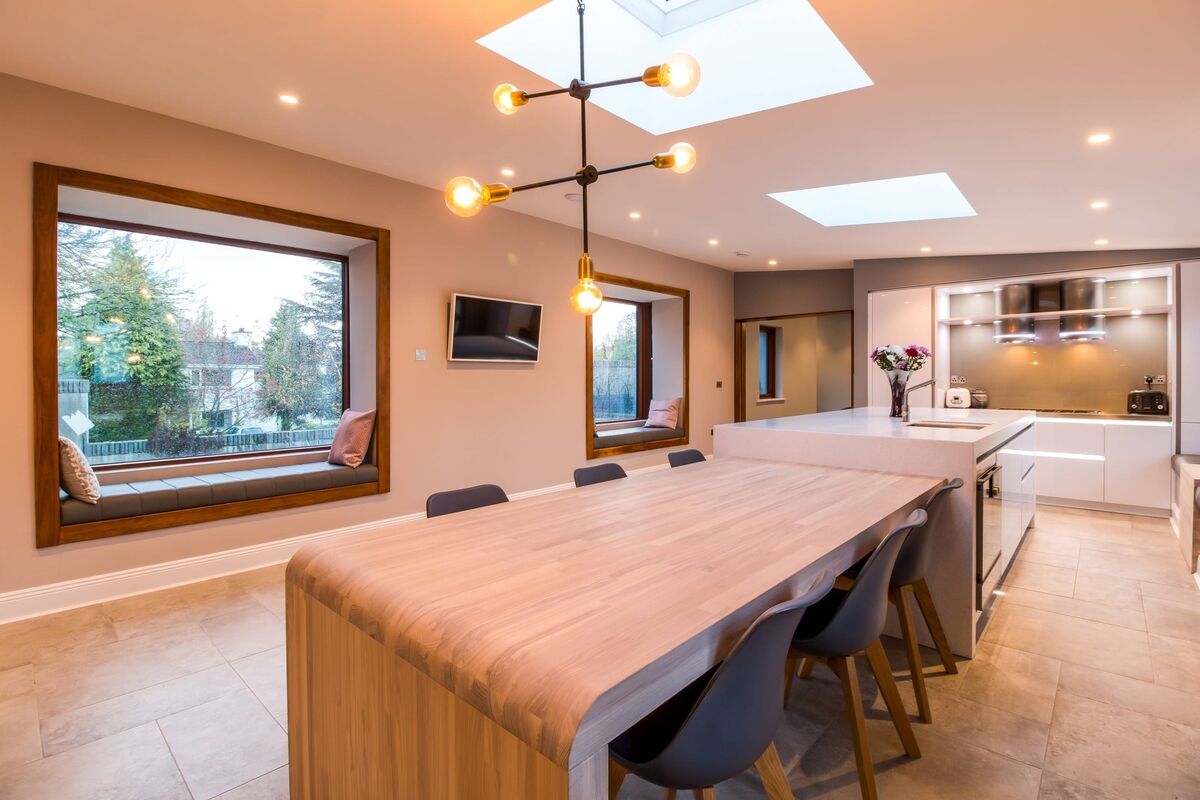 On the opposite end of the kitchen high gloss doors open out and secretly slide back to reveal a work station and glasses store, next to Rocket-brand expresso coffee station, along with wine fridge and bottle alcove. Watching over are two, large ‘picture windows’ with squab seating, and the long, double aspect room has twin overhead roof windows to draw in extra natural light. Meanhile,a sliding door gives access to an adjoining living room, which has access to an outdoor terrace.
