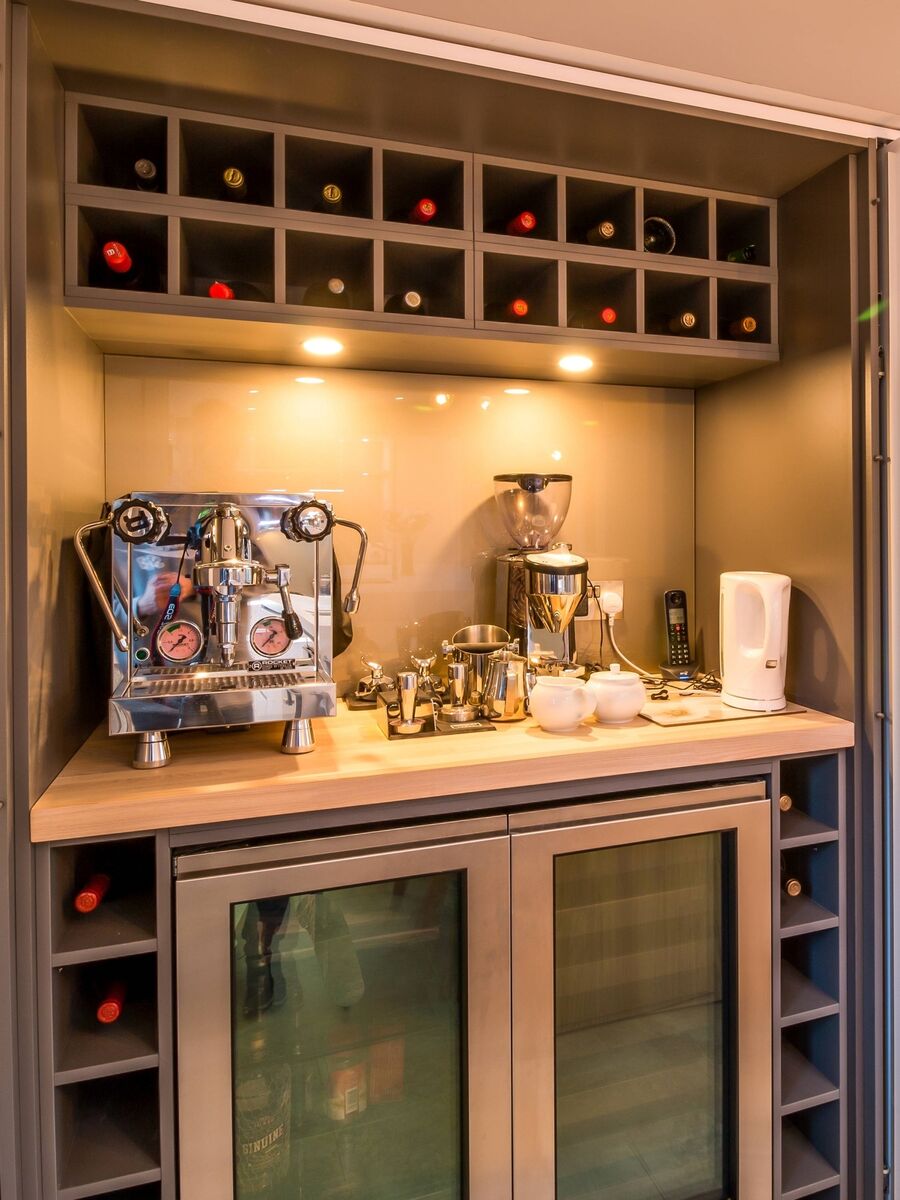 2. Drink from the bar? A kitchen alcove houses a wine fridge and bottle storage, while the worktop is set up for serious baristas, with an upmarket Rocket espresso coffee machine, bean grinder, tampers for compressing grinds, and more. Whole latte love, indeed.
