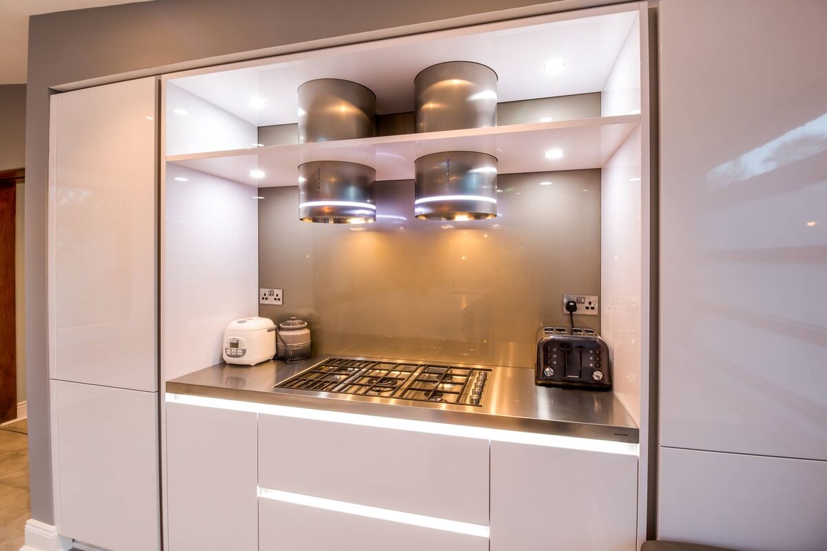 The Kube delivered units, with Danish timber side wing in the open plan kitchen/dining room is extensively and professionally thought out and laid out. Modern in style, with a high gloss white finish, the kitchen benefits from Gaggenau appliances which include double oven, steamer, microwave and vacuum wrapper all arranged around an extra-large island unit which houses double sinks. This island forms just one of the features within the kitchen and boasts mood lighting built-in. A bespoke designed piece by Spekva from Denmark connects with the island to give a formal dining space with light fitting overhead. A further fitted wall of units houses a larder press, integrated fridge freezer and five- ringed gas stainless steel Barazza hob unit and counter with glass splashback.