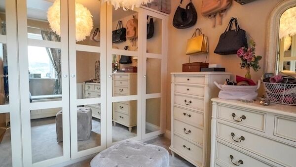 At mid level are two/three plushly-carpeted bedrooms, as what had been bed number four has been made over by the current owners into a dressing room, with extensive shelving and storage: it’s likely new owners may continue the same use/layout, but it’s readily put back as an occasional guest bedroom/nursery if needs be.