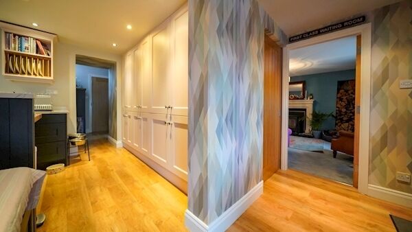 Meanwhile, at the all important ground level, there are rooms left and right of the central entry point, with a living room on the right. It has an integrated wood burning stove, and a wall alcove is stuffed to the gills with split logs, while the geometric wallpaper on several walls is a riot of fun, with its thunder almost stolen then by an even more colourful wooden chair, all the colours of the rainbow, and then some, for extra good measure.