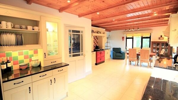 Located a little over 3km from Kenmare, the southwest-facing property overlooks landscaped gardens at the front and at the rear looks across to the mountains on Beara.