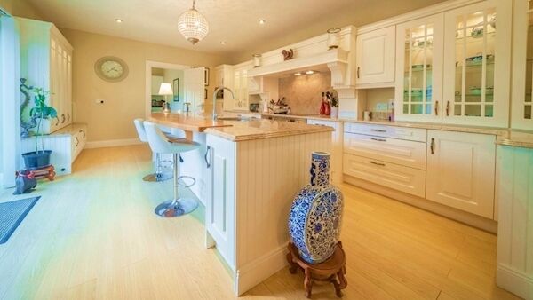 The kitchen comes with two double AEG ovens and Liebherr integrated fridge freezer. Because the kitchen faces south-west the owner says it gets lovely sunlight all day long. Doors lead onto the large patio from here and the utility room which is also kitted out with lots of great storage.