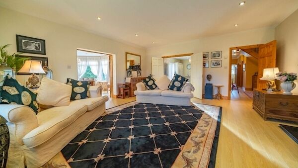 The exceptionally wide hallway leads into a large living room with feature recess wood burner with marble surround and hearth. Double doors lead up to a light-filled sunroom currently being used as a dining room looking onto a south facing large patio area.