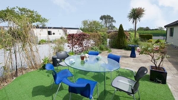 Apart from hard landscaping, paths, the tarmac tennis court etc, the rest of the acre’s extremely well planted up with native Irish trees such as Alder, Ash, Beech (hedging) Birch, Rowan, and Willow, along with exotics like acer palms, bamboos, an olive tree, Eucalyptus, and masses of shrubs such as Camellias, Clematis (especially by the garden ‘picnic room’), Hydrangea, Magnolias, Viburnum and Wisteria, plus plants such as Agapanthus, Digitalis and Osteopermum.
